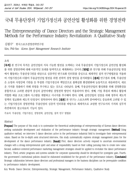 주요어: 무용단장, 기업가정신, 경영전략, 공연산업, 질적 연구 방법론