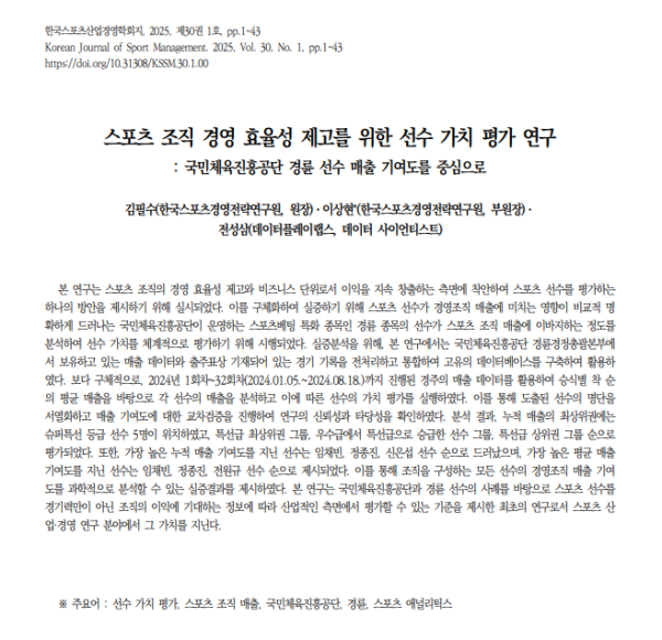 본 연구는 스포츠 조직의 경영 효율성 제고와 비즈니스 단위로서 이익을 지속 창출하는 측면에 착안하여 스포츠 선수를 평가하는 하나의 방안을 제시하기 위해 실시되었다. 이를 구체화하여 실증하기 위해 스포츠 선수가 경영조직 매출에 미치는 영향이 비교적 명 확하게 드러나는 국민체육진흥공단이 운영하는 스포츠베팅 특화 종목인 경륜 종목의 선수가 스포츠 조직 매출에 이바지하는 정도를 분석하여 선수 가치를 체계적으로 평가하기 위해 시행되었다. 실증분석을 위해, 본 연구에서는 국민체육진흥공단 경륜경정총괄본부에 서 보유하고 있는 매출 데이터와 출주표상 기재되어 있는 경기 기록을 전처리하고 통합하여 고유의 데이터베이스를 구축하여 활용하 였다. 보다 구체적으로, 2024년 1회차~32회차(2024.01.05.~2024.08.18.)까지 진행된 경주의 매출 데이터를 활용하여 승식별 착 순 의 평균 매출을 바탕으로 각 선수의 매출을 분석하고 이에 따른 선수의 가치 평가를 실행하였다. 이를 통해 도출된 선수의 명단을 서열화하고 매출 기여도에 대한 교차검증을 진행하여 연구의 신뢰성과 타당성을 확인하였다. 분석 결과, 누적 매출의 최상위권에는 슈퍼특선 등급 선수 5명이 위치하였고, 특선급 최상위권 그룹, 우수급에서 특선급으로 승급한 선수 그룹, 특선급 상위권 그룹 순으로 평가되었다. 또한, 가장 높은 누적 매출 기여도를 지닌 선수는 임채빈, 정종진, 신은섭 선수 순으로 드러났으며, 가장 높은 평균 매출 기여도를 지닌 선수는 임채빈, 정종진, 전원규 선수 순으로 제시되었다. 이를 통해 조직을 구성하는 모든 선수의 경영조직 매출 기여 도를 과학적으로 분석할 수 있는 실증결과를 제시하였다. 본 연구는 국민체육진흥공단과 경륜 선수의 사례를 바탕으로 스포츠 선수를 경기력만이 아닌 조직의 이익에 기대하는 정보에 따라 산업적인 측면에서 평가할 수 있는 기준을 제시한 최초의 연구로서 스포츠 산 업·경영 연구 분야에서 그 가치를 지닌다.