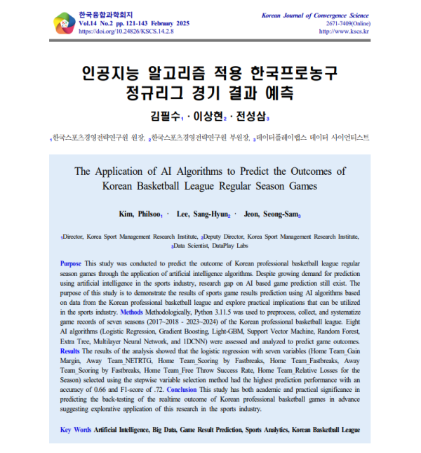 연구목적 본 연구는 인공지능 알고리즘을 적용하여 한국프로농구 정규리그 경기의 결과를 선행적으로 예측하기 위해 시행되었다. 스포츠산업 현장에서 인공지능을 적용한 예측에 대한 수요가 높아지고 있지만 아직 선행적 경기 예측 연구에 관한 학술적 연구가 부족한 실정이다. 본 연구의 목적으로 한국프로농구리그 데이터를 기반으로 인공지능 알고리즘을 적용한 경기결과 예측 결과를 실증하고스포츠, 산업 현장에서 활용할 수 있는 실무적 방안을 탐색적으로 제시하는 것에 있다.