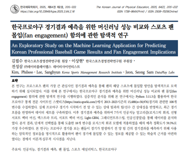 본 연구는 프로스포츠 팬의 가장 큰 관심사인 경기결과 예측을 통해 팬의 해당 스포츠에 몰입할 방안을 탐색적으로 모색 하기 위해 실시되었다. 이를 위해 본 연구에서는 한국프로야구 경기결과 예측을 위한 머신러닝 성능 비교와 팬 몰입(fan engagement) 함의에 관한 탐색적 연구를 시행하였다. 실증적인 분석을 위해 본 연구에서는 Python 3.11.5을 활용하여 한국 프로야구 통계 전문 사이트인 스탯티즈(https://statiz.sporki.com/)에서 2013~2023시즌의 15,488(n=30,976)경기와 관련한 108개 변수를 수집하였다. 실제 프로야구 경기가 시작하기 전 알 수 있는 상대 팀과의 팀/선수 간 상대성을 반영하고, 최근 경기 흐름을 반영하여 데이터 세트를 구축하였다. 이후 경기결과 예측을 위하여 7가지 인공지능 알고리즘(로지스틱 회귀, 선형 서포트 벡터 머신, 엑스트라 트리, 서포트 벡터 머신, Light-GBM, 그래디언트부스팅, 인공신경망)을 통해 데이터를 분석하 였다. 분석 결과, 단계적 선택법을 통해 도출한 18개 변수를 로지스틱 회귀 모델에 적용하였을 때의 예측 정확도가 59.3%로 가장 우수하였다. 본 연구는 프로야구 경기를 보는 팬들이 경기가 발생하기 전 양 팀 간의 경기결과를 예측하기 위해 사용 하는 암묵적인 정보들을 명시적으로 활용하여 팬이 경기에 몰입할 수 있는 정보를 제공할 수 있는 학술적 근거를 마련하 였다는 점에서 이론적·실무적 시사점을 지닌다