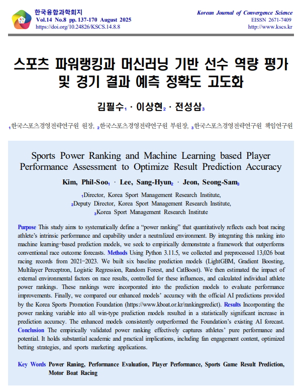 본 연구는 스포츠 경기 외부 환경 변동의 영향을 최소화한 상황에서 선수 개개인의 순수 경기력이나 역량을 정량화하여 객관적으로 등급화 평가할 수 있는 선수 파워랭킹 을 ‘ (Power Ranking)’ 체계적으로 개념화하고 이를 머신러닝 예측모형에 통합함으로써 기존 경기 결과 예측 성능을 뛰어넘, 는 고도화된 프레임워크를 실증적으로 제시하는 데 그 목적이 있다.