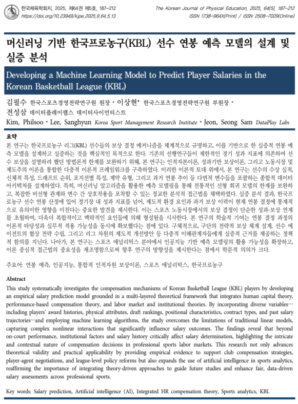 주요어: 연봉 예측, 인공지능, 통합적 인적자원 보상이론, 스포츠 애널리틱스, 한국프로농구