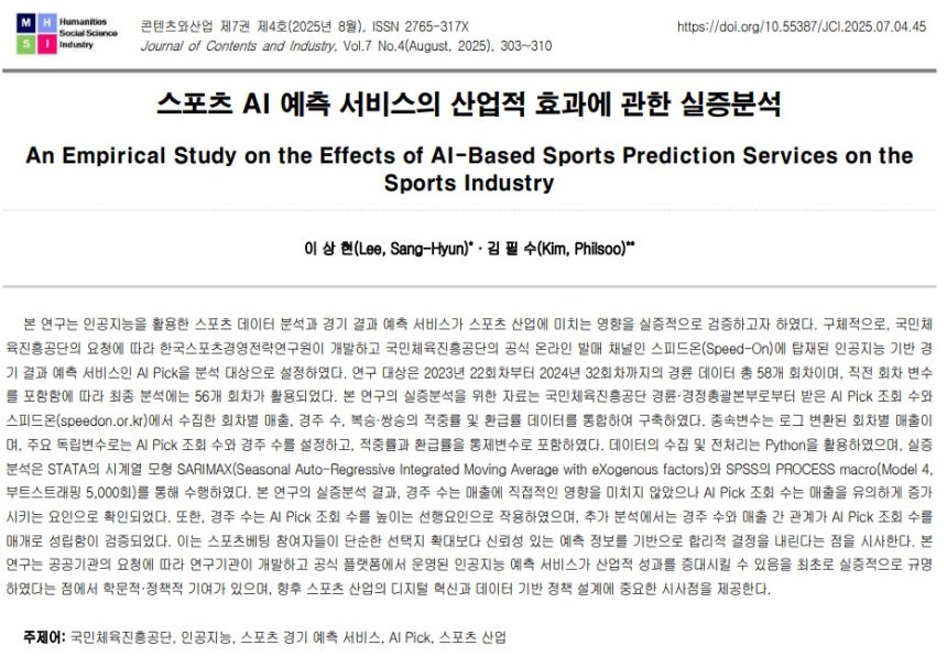 AI 픽은 국민체육진흥공단의 프로젝트 발주로 한국스포츠경영전략연구원이 개발한 서비스다. 이번 연구 결과는 한국콘텐츠산업학회에서 발행하는 '콘텐츠와산업' 8월호에 게재됐다.