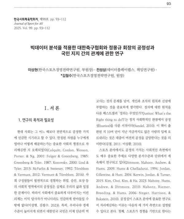 Purpose: This study examines changes in public perception and support for the Korea Football Association (KFA) and its president, Chung Mong-kyu, through big data analysis. The objective of this research is to empirically assess the impact of KFA’s decision-making regarding fairness issues on public support.