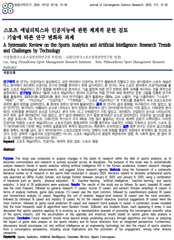 Keyword: 스포츠 애널리틱스, 인공지능, 체계적 문헌 검토, 스포츠 융합