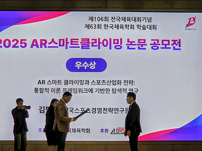 수상 논문은 'AR 스마트 클라이밍과 스포츠산업화 전략: 통합적 이론 프레임워크에 기반한 탐색적 연구'다. 연구원 측은 디지털 전환 시대에서 스포츠 산업의 발전 방향을 제시, 학문적 가치와 실무적 기여도를 인정받았다고 했다.