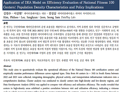 AI(인공지능) 기반 스포츠 데이터 분석 기업 데이터플레이랩스가 국민체육진흥공단 '국민체력100 체력인증센터'의 운영 효율성을 분석한 연구 결과를 한국체육학회지(64권 6호)에 발표했다. 이번 연구는 전국 84개 센터의 2022~2025년 운영 데이터를 자료포락분석(DEA) 모형으로 분석, 공공 체육 정책의 효율성 향상을 위한 실증적 근거를 제시했다.