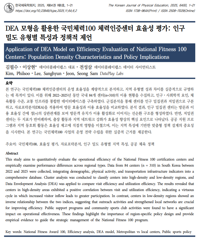 AI(인공지능) 기반 스포츠 데이터 분석 기업 데이터플레이랩스가 국민체육진흥공단 '국민체력100 체력인증센터'의 운영 효율성을 분석한 연구 결과를 한국체육학회지(64권 6호)에 발표했다. 이번 연구는 전국 84개 센터의 2022~2025년 운영 데이터를 자료포락분석(DEA) 모형으로 분석, 공공 체육 정책의 효율성 향상을 위한 실증적 근거를 제시했다.