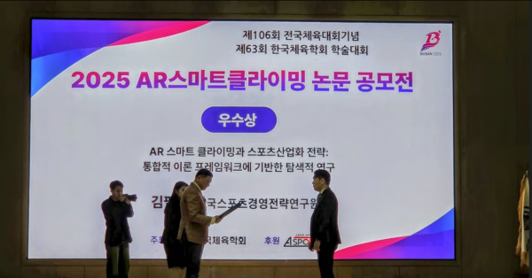 수상 논문은 'AR 스마트 클라이밍과 스포츠산업화 전략: 통합적 이론 프레임워크에 기반한 탐색적 연구'다. 연구원 측은 디지털 전환 시대에서 스포츠 산업의 발전 방향을 제시, 학문적 가치와 실무적 기여도를 인정받았다고 했다.