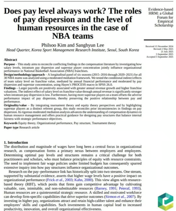 해당 논문 'Does pay level always work? The roles of pay dispersion and the level of human resources in the case of NBA teams'는 국제 학술지 'Evidence-based HRM: a Global Forum for Empirical Scholarship' 2025년 11월호에 게재됐다.