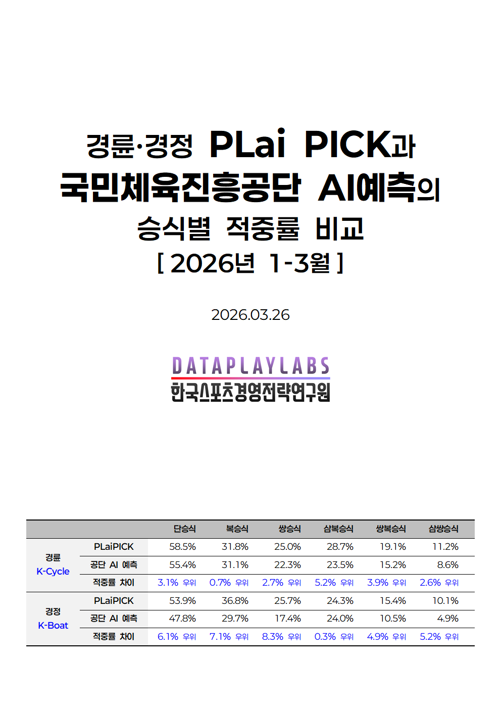 2026년3월 '경륜경정 PLai PICK'과 '국민체육진흥공단 AI 예측' 적중률 비교 및 경주별 예측 결과 한국스포츠경영전략연구원 2026-03-26 한국스포츠경영전략연구원 0 6 03.26 21:47 2026.03.26 21:47 경륜경정_적중률비교_appendix3월.pdf (129.6K) + 0 ssjeon@k-spo.co.kr *PDF 파일 다운로드 가능 게시물신고 사용자신고