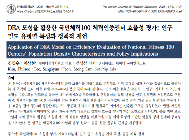 연구는 국민체력100 체력인증센터의 운영 효율성을 계량적으로 분석하고, 지역 유형별 성과 차이를 실증적으로 규명하 는 데 목적이 있다. 이를 위해 2022~2025년 동안 국내 84개 센터(n=310)의 이용 현황을 수집하고, 인구⋅사회학적 요인, 체 육활동 수준, 교통 인프라를 통합한 데이터베이스를 구축하였다. 군집분석을 통해 센터를 인구 밀집권과 저밀권으로 구분 하고, 자료포락분석(DEA)을 적용하여 방문 효율성과 이용 효율성을 비교하였다. 분석 결과, 인구 밀집권 센터는 방문과 이 용 효율성 간에 정(+)의 상관관계를 보여 방문객 유치가 이용 활성화로 이어지는 선순환 구조를 형성하였다. 반면, 저밀권 센터는 두 지표가 반비례하며, 출장 활동과 지역 네트워크 강화가 효율성 향상의 핵심 요인으로 나타났다. 공공 지원 프로 그램과 지역 동호회 활동은 효율성 제고에 직접적 영향을 미쳤으며, 이는 지역 특성에 기반한 맞춤형 정책 설계의 중요성 을 시사한다. 본 연구는 국민체력100 사업의 운영 전략 수립을 위한 실증적 근거를 제공한다. 주요어: 국민체력100, 효율성 평가, 자료포락분석, 인구 밀도 유형별 지역 특성, 공공 체육 정책