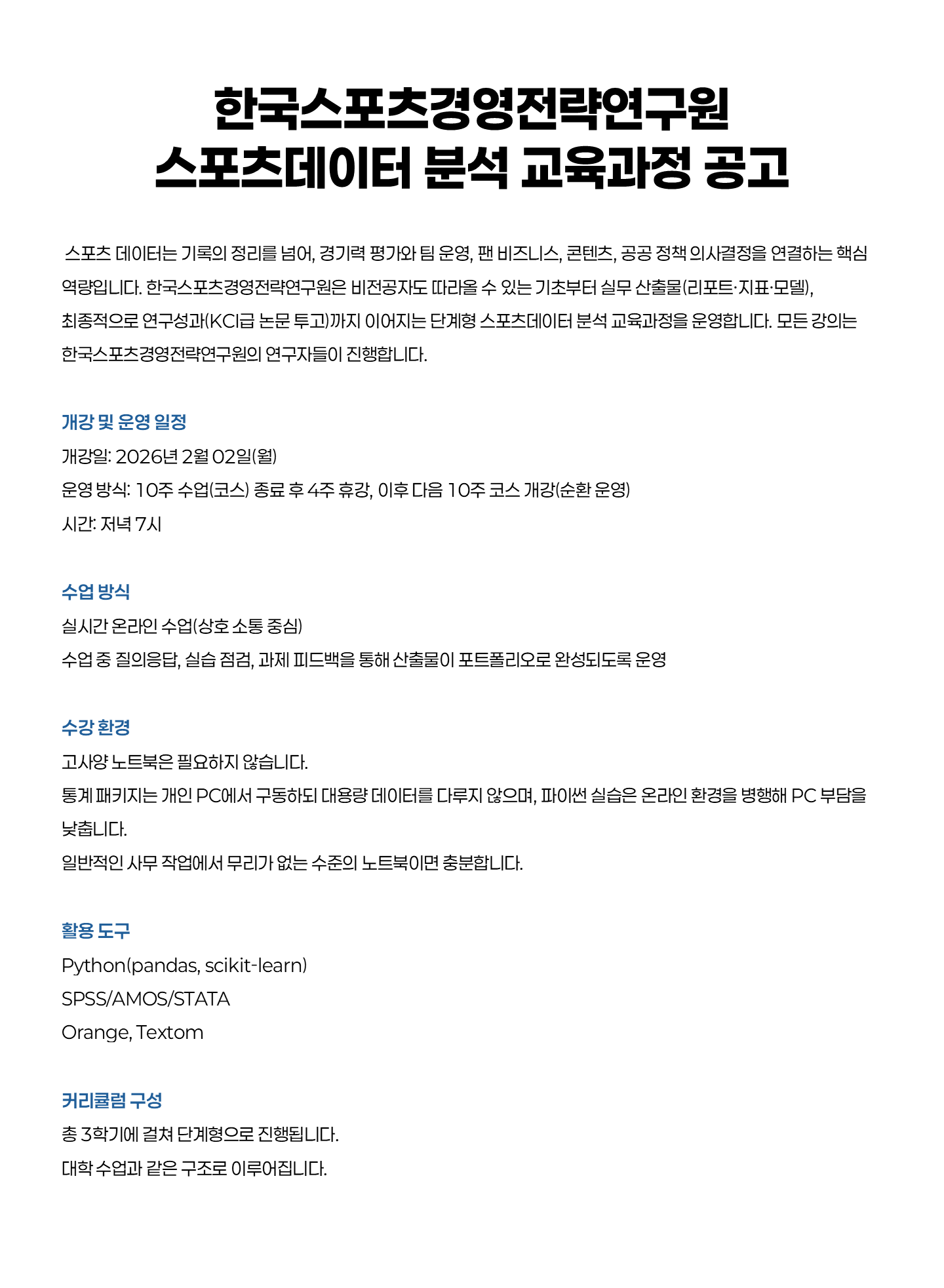 한국스포츠경영전략연구원 스포츠데이터 분석 교육과정 공고(~1/19) 한국스포츠경영전략연구원 2026-01-02 한국스포츠경영전략연구원 0 64 01.02 15:12 2026.01.02 15:13 한국스포츠경영전략연구원 스포츠데이터 분석 교육과정 모집공고.pdf (147.7K) + 0 ssjeon@k-spo.co.kr 게시물신고 사용자신고